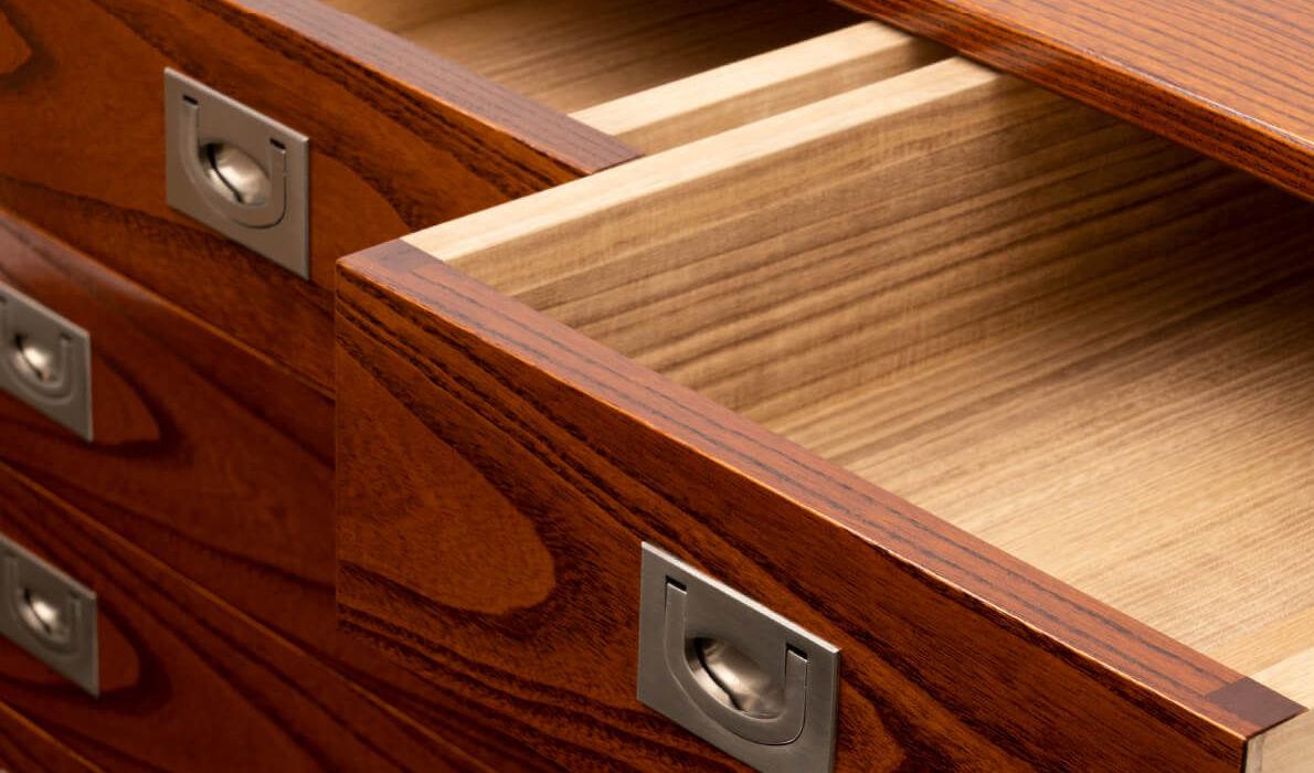 Each chest or table is built from paulownia harvested in Japan, planed and fitted to exacting tolerances of 1/100 millimeter.